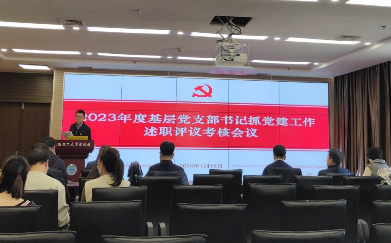 1月15日,在科技园B座8楼会议室,产业党委组织召开2023年度基层党支部书记抓党建工作述职评议考核大会。产业党委委员和领导班子成员出席会议,全体支部书记、支部委员参会。产业党委副书记、资产经营公司副总经理于长福主持会议。