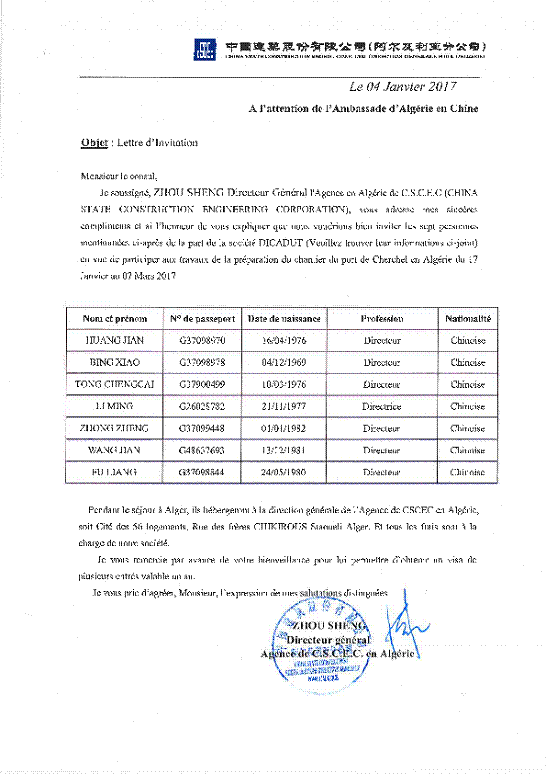 应 中国建筑股份有限公司(阿尔及利亚分公司)邀请,我单位黄建、邴晓、仝成才、钟政、李明、王剑、傅亮一行7人拟赴 阿尔及利亚 国家(地区)参与阿尔及利亚中心港项目前期工作。现将该团组拟出访情况公示如下: