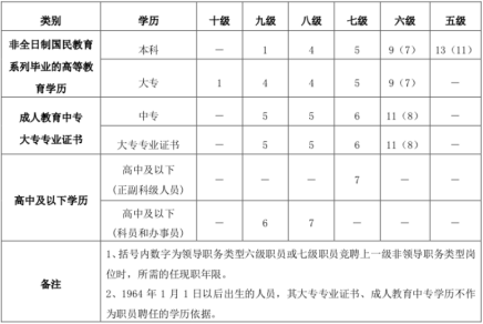 1.任副处级领导职务10 年以上,或任非领导职务类型六级职员12 年以上且距退休年龄不足两年的具有本科及以上学历人员,可以竞聘五级职员岗位。
